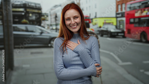 Fototapeta premium Woman smiling on city street with cars passing by, highlighted by vibrant red hair and casual outfit in urban outdoor setting suggesting british atmosphere.
