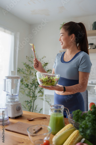 © crizzystudio, Obraz premium Woman smiling while preparing fresh healthy salad
