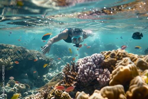 Fototapeta premium Woman snorkeling is exploring underwater marine life of coral reef