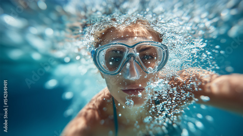 © dinatychynska, Naklejka premium Woman snorkeling underwater in crystal-clear blue water, surrounded by bubbles. Capturing the joy of summer vacation, travel, and aquatic adventures.