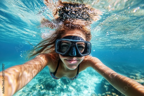 Fototapeta premium Woman snorkeling underwater selfie, hair flowing. Perfect for travel, adventure, and summer blogs.