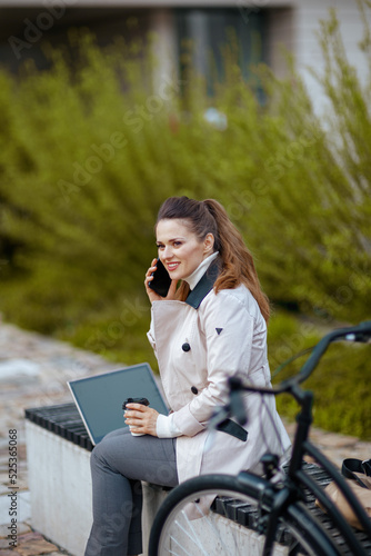 Fototapeta premium woman speaking on smartphone and using laptop outdoors in city
