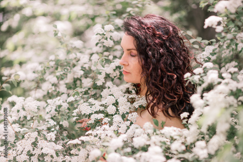 © svetograph, Fototapeta premium Woman spirea flowers. Portrait of a curly happy woman in a flowering bush with white spirea flowers.
