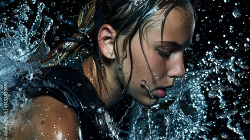 Fototapeta premium Woman standing below a dark showerhead with water cascading over her in a...