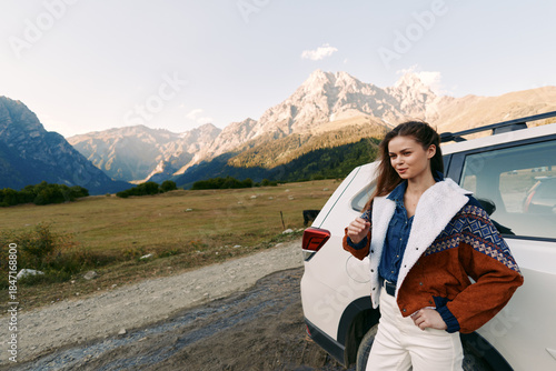 Fototapeta premium Woman standing by car on mountain road, travel and outdoors lifestyle portrait with scenic landscape. Casual jacket and confident pose near SUV for road trip adventure and exploration.