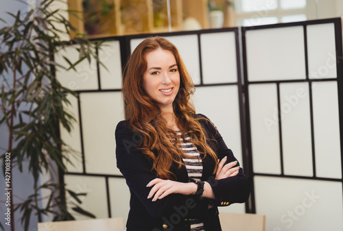 © wavebreak3, Fototapeta premium Woman standing confidently in office space, with smartwatch, glass divider and bamboo plant