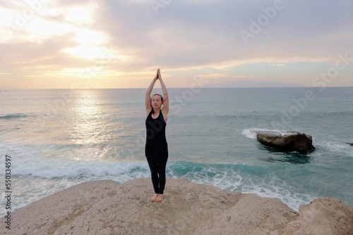 Fototapeta premium Woman standing in a tadasana pose in front of the beautiful sea