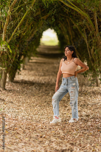 Naklejka premium Woman standing in a tunnel of trees with fallen leaves on the ground