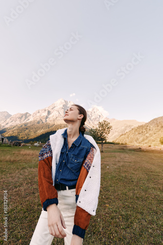Fototapeta premium Woman standing in field with mountains in background, wearing patterned sweater and denim shirt, portrait style fashion shot in autumn light, casual model outdoors.