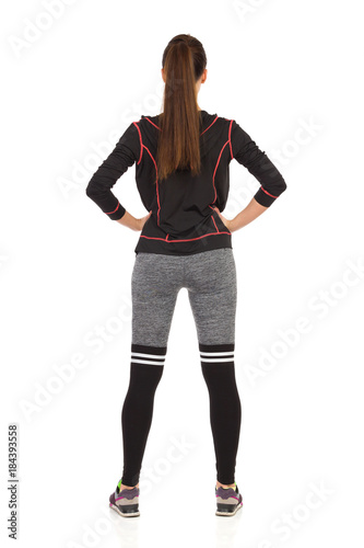 Fototapeta premium Woman Standing Legs Apart In Fitness Outfit. Rear View.