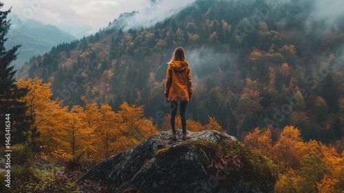 © Crafted, Obraz premium Woman standing on a rock, looking at the beautiful foggy mountain landscape