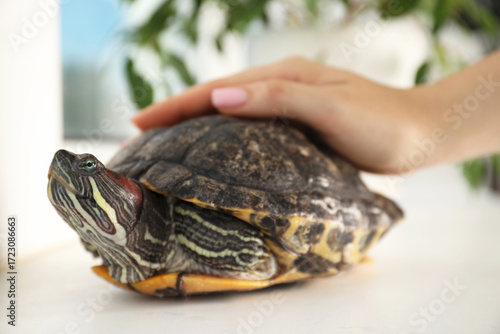 Obraz premium Woman stroking cute turtle pet at window sill, closeup
