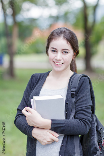 © venusangel, Fototapeta premium woman student holding a book with happily on the outdoor in university