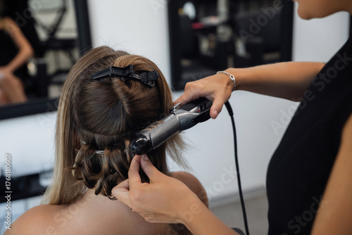 Fototapeta premium Woman styling hair at a modern salon while using a curling iron with a...