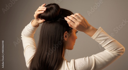 Naklejka premium Woman styling her long dark hair into a bun. Female creating an elegant updo with a hairpin. Hair care and beauty concept on a neutral background