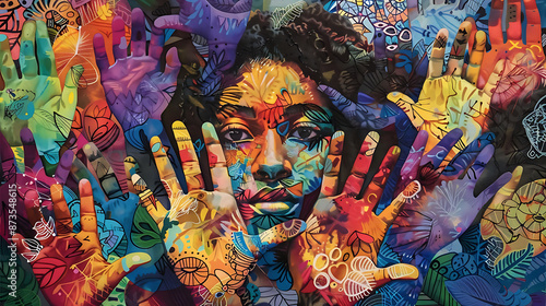 © Tazzi Art, Obraz premium Woman Surrounded by Colorful Handprints. Art, Diversity, and Expression
