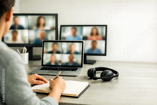 © Faisal, Fototapeta premium Woman taking notes during video conference with multiple monitors