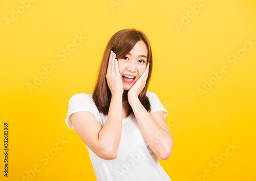© sorapop, Fototapeta premium woman teen stand surprised excited celebrating open mouth gesturing palms on face
