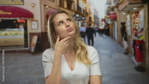 Fototapeta premium Woman thinking on lively city street with blonde hair, wearing white shirt, surrounded by shops and urban environment, reflecting an outdoor lifestyle.