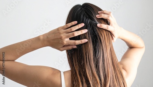 © ruangrit19, Naklejka premium Woman Touching Her Long Straight Brown Hair Back View.
