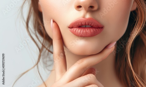 © Dalibor, Obraz premium Woman touching her red lips, showcasing perfect lip makeup. Free copy space for text.
