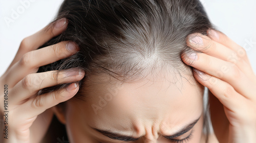 Naklejka premium woman touching her scalp, showing signs of hair loss and concern
