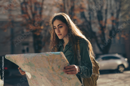 © antgor, Naklejka premium Woman tourist exploring city while holding map