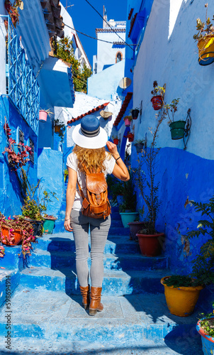 Fototapeta premium Woman tourist walking in Chefchaouen- blue city in Morocco