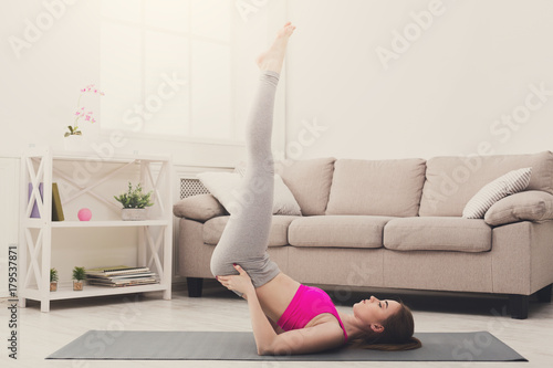 © Prostock-studio, Fototapeta premium Woman training yoga in shoulder stand pose.