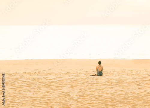 Obraz premium Woman traveler doing sit on tropical beach in vacation.