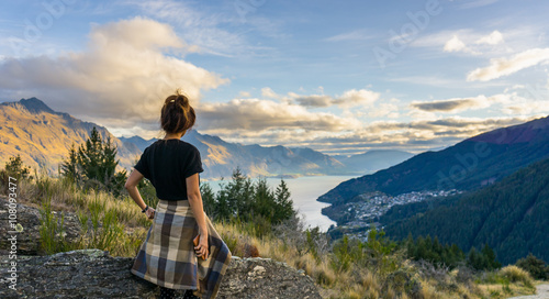 Naklejka premium Woman traveler looking at Lake