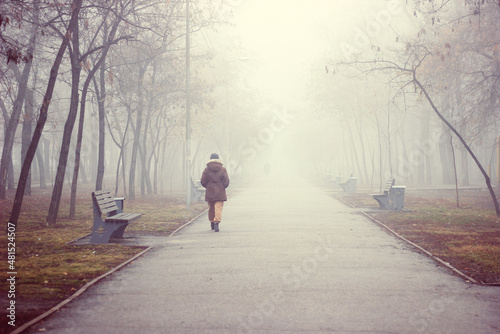 Fototapeta premium Woman traveler walks along a foggy road in the early morning. Concept of...