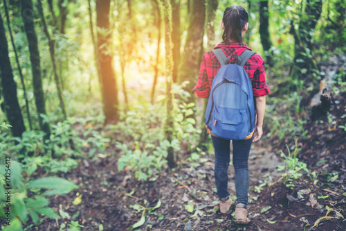 Fototapeta premium woman traveler with backpack hiking in young hiking holiday.adventure,...