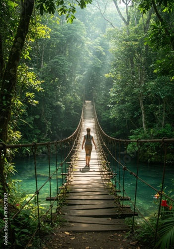 © Febi, Fototapeta premium Woman Trekking Across Rustic Suspension Bridge in Lush Green Jungle