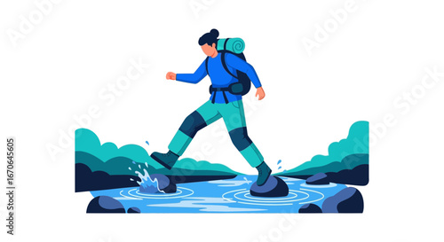 © Chelsi, Obraz premium Woman Trekking Across Stream Illustration On A Sunny Day With Backpack