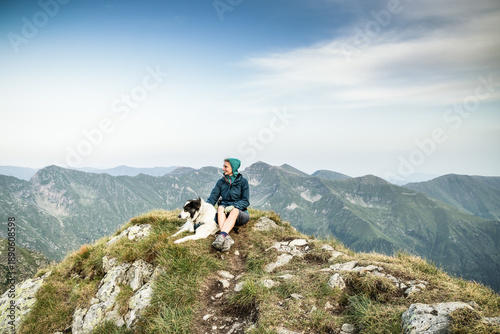 © Melinda Nagy, Fototapeta premium woman trekking with a dog in high mountains