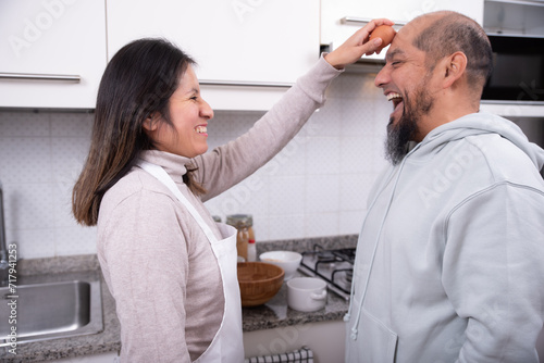 © Gusta Cabrera, Obraz premium Woman tries to break an egg on her partner's forehead while he laughs.