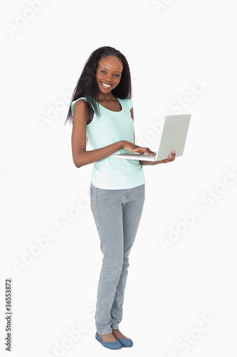 © WavebreakmediaMicro, Fototapeta premium Woman typing on her laptop on white background