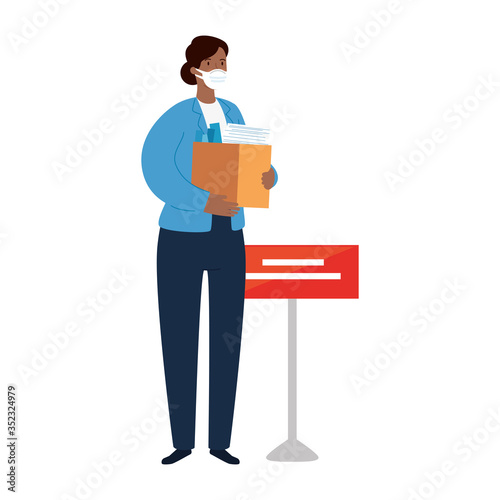 © Gstudio, Obraz premium woman unemployment concept, company worker holding stuff in box, from coronavirus crisis covid 19 vector illustration design