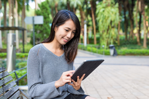 © leungchopan, Fototapeta premium Woman use of digital tablet at park