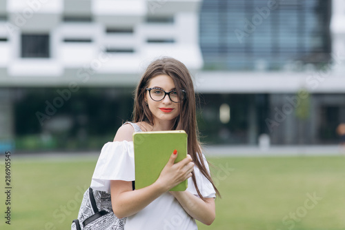 © uflypro, Obraz premium Woman uses tablet computer stand near business center. Attractive technology girl. Young woman work screen smart. Professional holding portrait