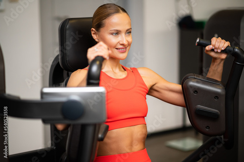 © Minerva Studio, Obraz premium Woman using a chest press machine in a gym