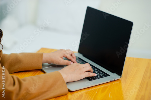 © FOTO SALE, Fototapeta premium Woman using a laptop, searching the web, browsing information, having a workplace at home Doing business online at home. Online business concepts
