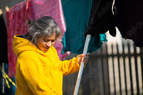 Obraz premium Woman Using Clothe Lines To Dry Clothes In an Energy Efficient Way
