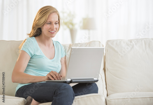 © tmc_photos, Naklejka premium Woman Using Laptop On Sofa In Living Room