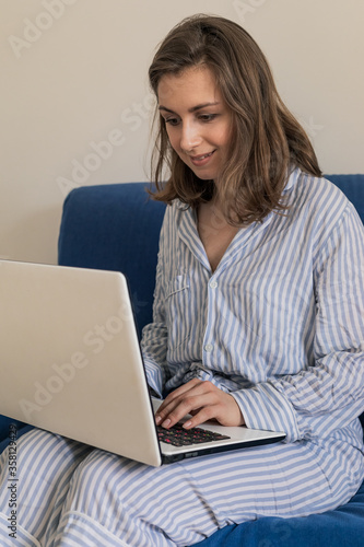 Naklejka premium Woman using laptop personal computer on sofa. Work from home