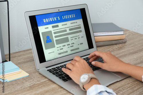 Fototapeta premium Woman using laptop to fill driver's license application form at table in...