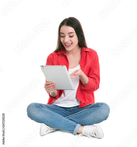 Fototapeta premium Woman using tablet for video chat isolated on white