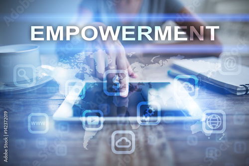 © WrightStudio, Fototapeta premium Woman using tablet pc, pressing on virtual screen and selecting empowerment.