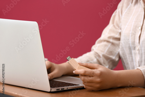 Naklejka premium Woman using USB flash drive with modern laptop at wooden table near color wall, closeup
